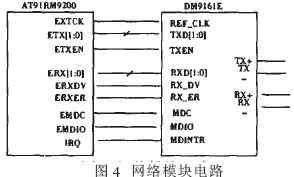 AT91RM9200 的在片以太网卡端口和网络物理层芯片DM9161E 的MII 接口通信。发送数据时, 首先置发送使能信号ETXEN 有效。数据发送端ETX0~ETX1与DM9161 的ETXO~ETX1 引脚对应连接, 作为数据发送通道, 以DM9161E 的时钟信号REF_CLK 发送数据。数据接收端ERX 0~ERX1 与DM9161E 的RXDO~RXD1 引脚对应连接, 作为数据接收通道。管理时钟信号EMDC 和管理数据输入输出信号EMDIO 用来芯片控制参数的写入和读取。DM9161E 的MDINTR 端用来产生中断信号。