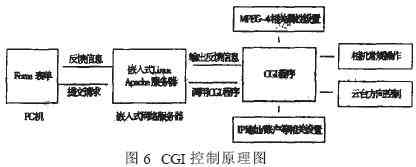 CGI(Common Gateway Interface) 是外部扩展应用程序与WWW 服务器交互的一个标准接口。本系统CGI 的工作过程: 在PC 机端的IE 浏览器中输入网络摄像机IP 地址, 嵌入式网络服务器根据请求, 将相应的控制页面反馈给IE 浏览器, 用户填写表单, 然后提交, CGI 程序提取表单的信息, 根据不同信息来分别处理相应的事件, 如调节MPEG- 4 相关属性、相机的相关操作等。CGI 控制原理如图5 所示。