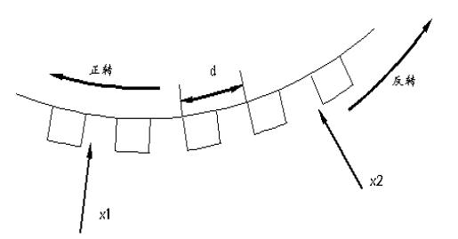 假设任意两齿之间距离为d,只要x1 和x2 之间距离不等于n/2.d(n 为任意整数),则转盘转动时,x1、x2 两处的输出波形就将如图3 所示。