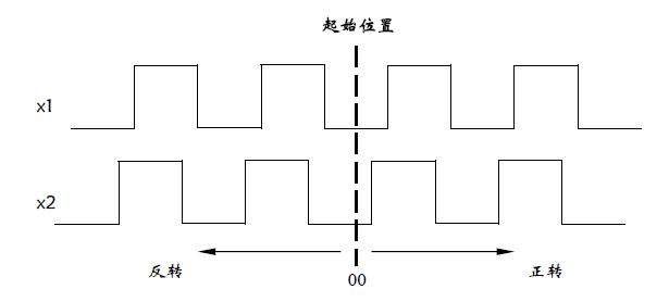 在实际设计过程中,要判断方向盘的转向以及转动角度,也就是说首先要判断左转还是右转,然后判断转的角度。方向盘的转动方向和转动角度示意图如图2 所示,选用两个光电感应开关JK122,安装在转盘旁边,x1 和x2 处为两个光电感应开关所放位置,当转盘转动时,有齿挡住光电感应开关,则输出为1,反之输出为0。