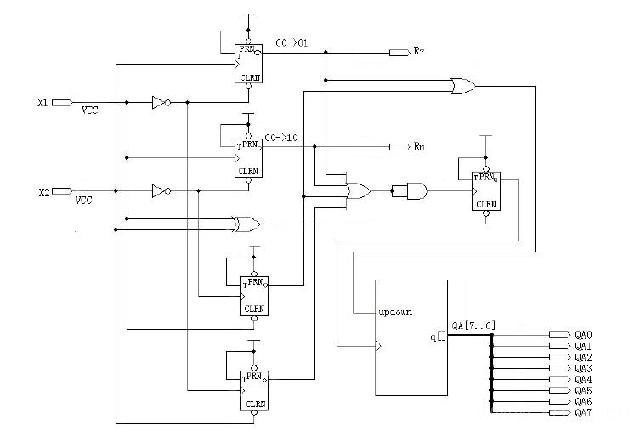 由此可见,假设x1、x2 的初始状态都为0,则正转时其状态变化为00—01—11—10—00, 而反转时状态变化为00—10—11—01—00。只要知道x1、x2 的当前状态和下一状态,即可知道此时方向盘的转向了。我们在设计时要判断好初始状态为00 这种情况。将x1、x2 信号分别接到两个T 触发器的输入端上,并将反向后的信号作为触发器的清零信号。当初始状态为00 时,两个触发器输出都为0,如果后一状态为01,则触发器T1 输出为1,表示正转;如果后一状态为10,则触发器T2 输出为1,表示反转。由于紧接着的状态肯定是11,所以触发器清零后,等到状态为00 又可以重新开始判断。判断转向后,还要判断转动的角度。在这里我们又加入两个T 触发器T3 和T4,当输入x1、x2 的状态从11 变化到10,触发器T3 输出为1,反之,如果从11 变化到01,触发器T4 输出为1。最后,将四个触发器的输出信号相或后作为时钟信号送到计数器中,并将T1、T3 的输出信号相或后作为计数器的输入信号,于是当方向盘正转时计数器向上累加,而反转时则向下递减,最后通过读出计数器的输出数据即可得知方向盘的转动角度。本文采用CPLD 技术设计控制电路,原理图如图4 所示。