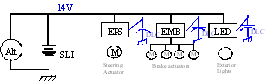 在这个高度简化的描述中,超级电容分布模块或双层电容(DLC)紧靠高耗能用电负载,如EPS(1.2KW)、电子机械刹车(1到2KW)和新型照明系统 (如最近出现的白光LED头灯)。本地分布式模块为高峰负载供电,避免造成来自交流发电机和电池的14V电源线出现强烈的波动。