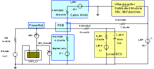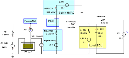 在上图中,汽车充电系统由交流发电机和铅酸电池来表示。在这种情况下,要利用Ansoft公司的汽车工具箱之中的Simplorer电化学建模工具对电池进行比较详细的建模。PowerNet被高度简化为由线规电阻建模的四个分支电路,包括引擎控制、车箱气候控制、本地ECU和EPS(最右边)。 PowerNet分配点被标注为PDB或电力分配箱。