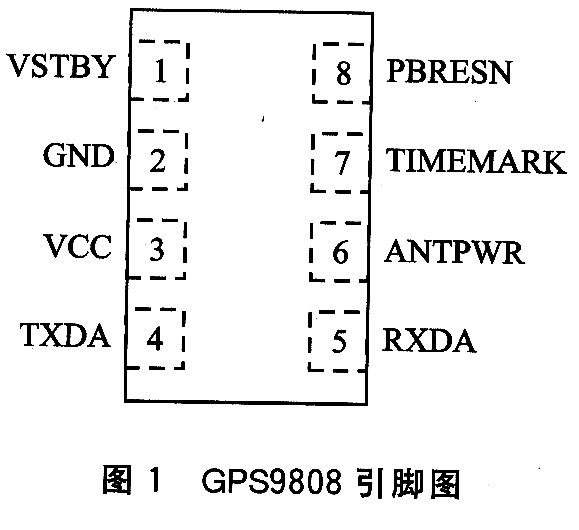 GPS9808是Leadtek(丽台)公司推出的一款功能强大、性能卓越的OEM模块。它在保持以前oEM模块优点的基础上进行了改良,是结构小巧、性能优良的低功耗12通道模块。它的热启动时间小于8 s,重捕时间小于0.1 s;定位精度在差分模式(DGPS)下小于5 m;接口采用串行TTL电平,数据格式支持标准NMEA—0183、SiRF二进制协议。模块外部的射频金属保护保证了在嘈杂环境下同样具有最佳性能,外型尺寸为24mm×20mm×2.6mm,功耗仅为215mW,非常适合在汽车电子等对功耗体积要求较高的系统中应用。GPS9808引脚分布如图1,各引脚的功能表1所列。