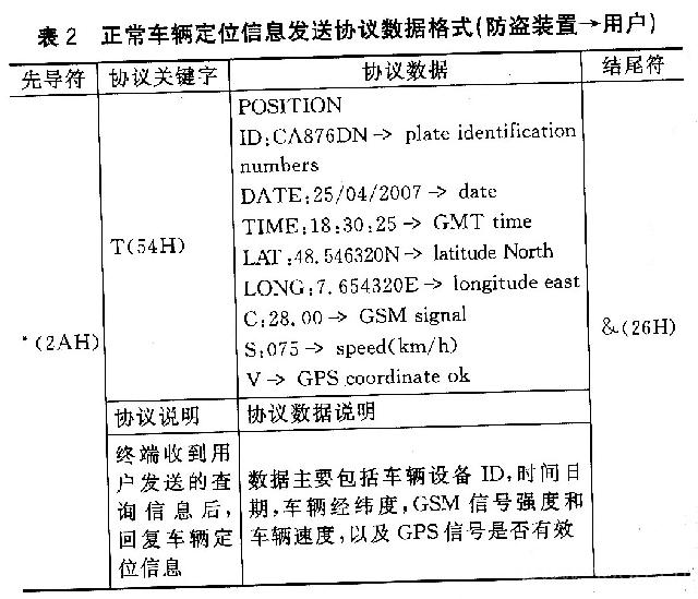 用户与防盗装置间的通信协议主要提供控制汽车状态以及查询汽车位置信息等功能。需要GPS9808提供数据的功能主要有:汽车定位信息查询、汽车正常停车区域范围设置、汽车跟踪设置等。因此不需要NMEA一0183通信协议提供的全部信息,只需要从中挑选出用得到的时间、经纬度、速度等数据位信息。