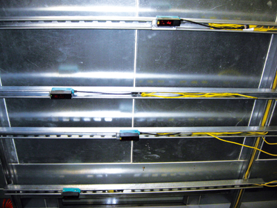 车型识别装置:该装置主要由两组相同高度的光电开关组成,一组为发射端(见图1),另一组为接收端(见图2)。每组光电开关中各光电开关的高度对应车身的不同部位。当滑橇碰到车型识别行程开关后开始进行检测,由于车身形状不同,光电开关被挡住的时间长短随不同车型有所不同。检测完毕后系统自动将各光电开关被挡住的距离与喷涂数据表中的设定值进行比较,由此确定车型。自动识别也可以采用载码体、读码器的方式进行,但其制造成本相对较高。
