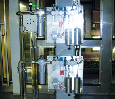 气动控制柜由分气罐、高压蓄能器、增压器、调压器及气动管路等组成(见图5)。主空气入口设置数显压力开关,用来显示入口空气压力并在压力低时产生报警。主空气进入气控柜后一路直接连接到喷杯气动轴承处,另一路又由球阀分成两路,一路接到机器人控制柜,供给机器人防爆空气;另一路进入分气罐。