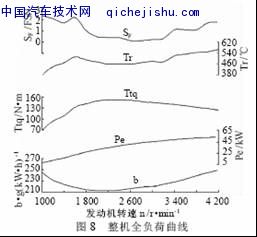 为了获得良好的冷起动性能,该机还配置了预热塞辅助起动系统;为了以后升级到满足欧Ⅳ排放,预留了微粒捕捉器、选择性还原催化转化器和氧化催化转化器配置功能;采取了降低机油耗、油气分离、液压气门间隙调节器等技术。图8为该机动力性水平曲线。