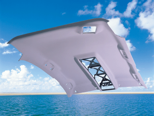 拜耳材料科技通过对其原有聚氨酯系统的改良,推出了新一代的Baynat聚氨酯硬质泡沫,其热力塑型性能提高了约30%。据说,这种材料在具有良好热力塑型性能的同时,仍维持了轻型材料的自承式性能,其密度为22kg/m3,甚至可以达到28~30 kg/m3。采用Baynat聚氨酯硬质泡沫与纤维饰面、装饰材料一起压缩成型的汽车顶板在130℃的温度条件下也不会变形,且拥有吸音、抗弯曲及抗裂的特质,其安装程序也更为方便。