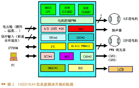 图4所示的是瑞萨H8S/228X仪表盘解决方案框图,其中左边的是电压输入,包括燃料、温度等等;还有脉冲输入,包括转速表和速度,框图中给出了各个功能模块。图的右边是4步进电机、PWM调光器、CAN和LCD。