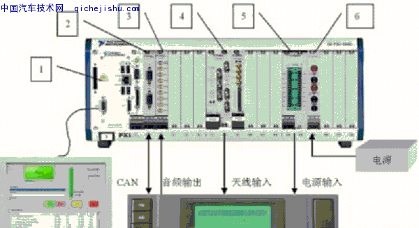 图2显示了一个典型的基于PXI TestStand的收音机测试系统。其中1为采用Pentinum M的PXI-8196嵌入式控制器,控制器上提供了串口、并口、以太网口、USB和GPIB等接口,并且所有的软件都在它上面运行;2为PXI-8664 CAN控制器,与收音机的CAN总线连接;3为PXI-4472动态信号采集卡,配合聚星的音频分析软件实现音频分析仪的功能,它同时和收音机的喇叭输出连接,8个输入通道可以和4声道平衡输出匹配;4为PXI-5671射频信号发生器,配合聚星的射频软件实现立体声无线电信号源的功能,它和收音机的天线输入连接;5为PXI-2565高性能继电器,负责电源开关和其他开关切换,它的接触电阻仅30毫欧姆,单路可承载5安培的电流;6为PXI-4070数字万用表模块,它和电源以及继电器连接,测量电流和电压,提供6位半的精度。以上是PXI TestStand检测平台的一个典型应用。被测件-收音机的CAN、音频、射频和电源是物理的测控对象,它们和各自的模块化仪器连接。模块化仪器都和PXI总线连接,交换测控数据和指令。所有的模块化仪器都有相应的软件控制,形成功能独立且可相互集成的测试软件模块。这些测试软件模块再由测试管理软件TestStand有机地构建成统一的测试流程。