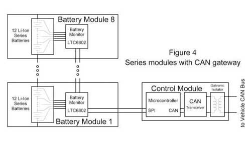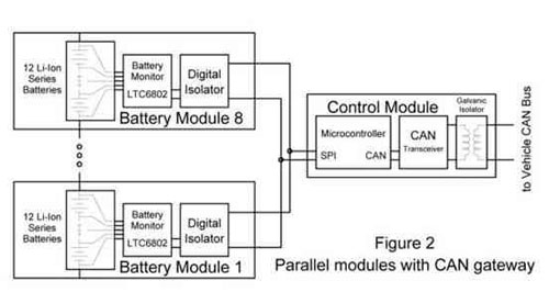每个由12个电池组成的模块都含有一个电路板,板上有LTC6802和数字隔离器。这些模块与控制器电路板有独立的接口连接,控制器电路板上含有微控制器、CAN接口和电流隔离变压器。微控制器协调这些模块并提供到汽车主CAN总线的网关。