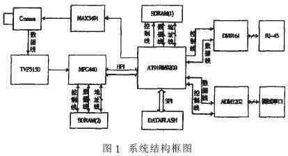 AT91RM9200 通过片内的SPI 总线和SDRAM控制器实现对外围DataFlash 和SDRAM的控制, 利用片内的USART 实现对串口芯片的控制, 通过片内的以太网控制器对片外网络芯片进行控制。其控制原理图如图2 所示。