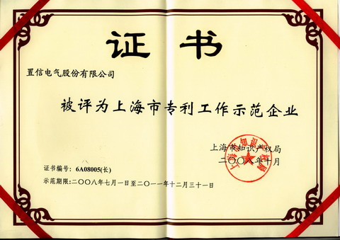 至2008年11月,置信电气已经获得授权专利63项。近日,经批准,上海置信电气股份有限公司被上海市知识产权局命名为“上海市专利工作示范企业”。