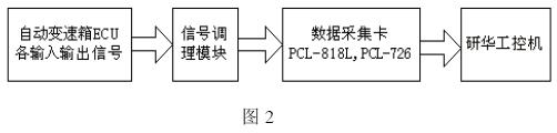 本数据采集系统硬件结构框图如图2。数据采集系统采集的信号包括从自动变速器ECU引出的所有输入、输出信号。这些信号主要有三种形式,即模拟信号、数字信号和脉冲信号。其中模拟信号和数字信号经过幅值转换等简单的调理之后就可以分别引入数据采集卡的模拟信号输入口和数字信号输入口,而脉冲信号需经过信号调理模块中的F/V信号转换电路将脉冲信号转换为标准的电压信号,然后作为模拟信号输入来采集。研华公司的数据采集卡PCL-818L可以16通道单端模拟信号输入采集,12位A/D转换和16通道数字信号采集,加上PCL-726数据采集卡提供的数字信号输入采集端口,能够满足系统的要求。最后使用工控机作为控制的主体,用以运行数据采集程序。