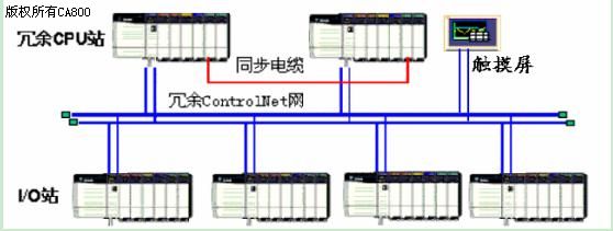 系统采用双机热备冗余配置,控制核心部件(CPU)配置两套,分别安装在两个独立的机架,两个机架的CPU通过光纤连接的同步模块同步热备运行,在任一套CPU及相关部件出现故障或错误时,会无扰动切换到另一套CPU,保证了系统的可靠稳定运行。PLC的IO模块安装在独立的IO机架,IO与CPU的通讯方式为冗余ControlNet网络。PLC的开关量输入输出点都选用继电器隔离,彻底防止了现场的干扰信号对系统的不良影响,保证了系统能够长期可靠运行。