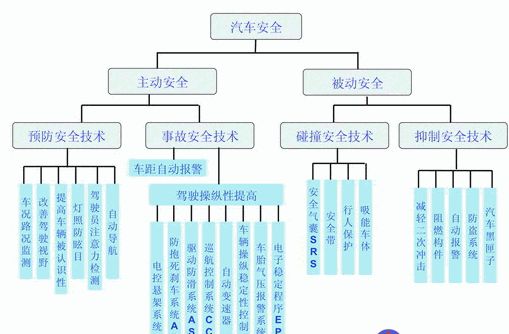 汽车安全涵盖的内容很多,图1显示了汽车安全方面的分类。