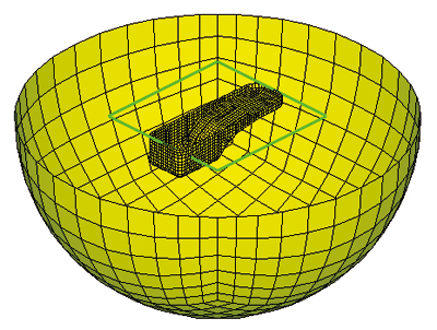 根据油底壳的结构参数及材料参数,建立了如图1所示的有限元模型。并进行了谐响应分析,得到了油底壳在螺栓加速度谱激励下的位移响应,作为辐射声场边界元分析的计算边界。同时,建立了如图2所示的油底壳边界元的半消声室模型,图中的半球形网格为按照ISO3744-1994要求建立的域点网格,半径为1.45m。