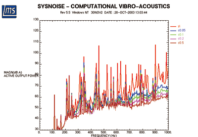 由图3、图4可以看出,输入和输出声功率级随损耗因子的增大都呈减小趋势,也即随着阻尼的增大,表面振动和辐射噪声都将减小,但趋势渐缓;而且,随着阻尼的增大,高频噪声降低明显,300Hz以下频率范围输入输出声功率均变化不大。
