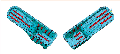 根据底面和左右侧面贡献率较大,以及峰值频率点的法向速度云图,在底面和左右侧面加工出凹槽以提高刚度。如图7的改进设计。图中红色的部位即为修改部位。