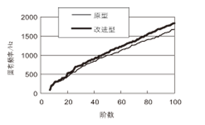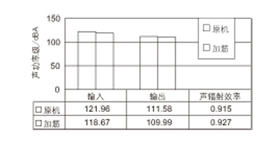 由图可知,在小于300Hz的范围内,原型和改进型的输出及辐射效率基本相等,而在原峰值频率点345 Hz、460Hz和900Hz处,改进型的输出有显著降低,但在大于750Hz的范围内又出现了多个峰值频率,尤其是785Hz处的振幅很大。综合的结果导致加筋后总的辐射声功率级降低1.6dBA。