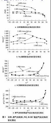 本实验分别在1400r/min和1800r/min,调节喷射延迟角,测量发动机的功率、燃气消耗率,NOx和HC,结果如图1所示。
