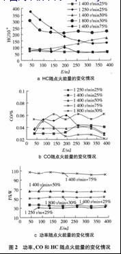 在点火能量的试验中,分别选取1250r/min,1400r/min和1800r/min的转速,点火能量从41~400W,分析其对功率,HC和CO的影响情况,如图2所示,从图2中可以看出: