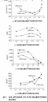 在稀薄燃烧的试验中,分别在1400r/min和1800r/min时,部分负荷时,过量空气系数(间从1.2变化到1.65时,分析其功率、燃气消耗率,NOx和HC的影响情况,如图3所示,从图3中可以看出: