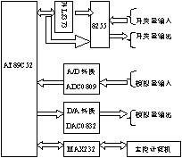 由于本系统中需要处理的开关量和模拟量较多,因此选用8255对输入输出接口进行了扩展。将AT89C52的P1口作为A/D、D/A转换接口,用于模拟量的输入和输出,A/D、D/A转换芯片分别选用ADC0809和DAC0832,片选信号由高位地址线P2口提供。8255的扩展接口用作开关量的输入和输出,8255的端口选择和片选信号由经74LS373锁存后的低位地址线提供。