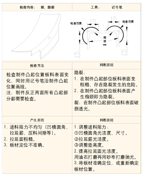 自检应按《冲压件品质检查要领书》进行重点检查和间隔全项检查。制定检查规范时,规范中应明确检查项目、检查内容、检查方法、使用工具、判断原则、产生原因和解决方法。