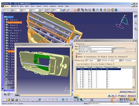 2.1我们使用SPA模块中的碰撞检查命令(Check Clash)对部件这间所有模块进行碰撞检查,预览窗口中红色部分表示干涉,黄色部分表示接触