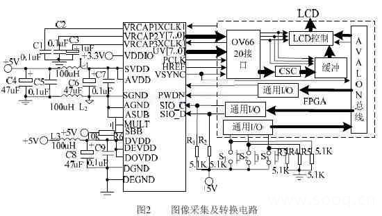 车辆电子后视镜系统的电路框图如图1所示。整个系统可划分为图像采集及转换、图像及信息显示、超声波测距、语音播报及警告、温度测量等部分。 CMOS图像传感器OV6620将采集到的图像数据送到FPGA中,处理后得到RGB888格式的数据,经LCD控制电路送往LCD屏上显示。超声波测距电路共有左右两个通道,利用频率为40kHz和25kHz两种超声波脉冲测量障碍物的距离及车辆的相对速度,随后进行危险评估再将相关的信息显示在LCD 屏上,并播报距离测量结果,然后控制报警电路发出急促程度不同的警示音。