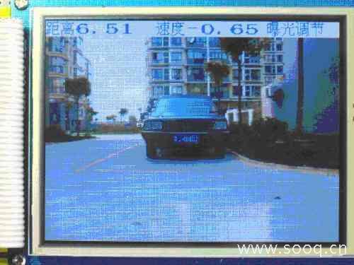 以Altera的DE2开发板为实验平台,利用该平台上两个通用I/O扩展槽外接实验电路板完成了本系统的设计验证。实验表明对于平面物体本系统超声波测距范围最小为7cm, 最大测量范围大于10m ,距离为2.5m以内时,测量误差不大于±1cm;语音提示清晰,LCD屏显示的图像清晰稳定。系统工作情况如图7所示,表示距障碍物(图5中车辆)距离为6.51m 、速度0.65m/s、当前处于曝光时间调节状态,速度是负值表示接近中。