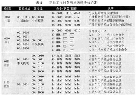 表3所列是中央控制模块与诊断模块的通讯报文定义。表中,aaaa为分段号,可在故障代码多于8个时设置,最多可达传送16×8个字节代码;bbbbbb为各传感器代号,其响应帧采用不分段的数据帧,cccccccc为执行相应动作的代码,如车窗上升为00000001,下降为00000010,该响应最多可以执行256个动作。响应帧采用远程帧,请求帧为远程帧。