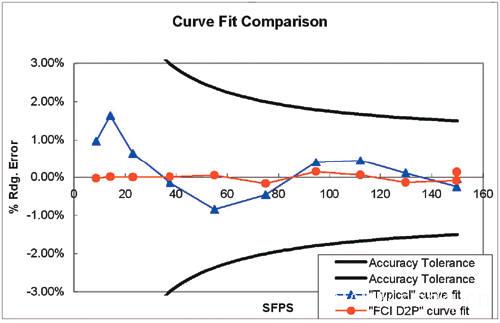 当热式传感技术在一致性和稳定性方面不断发展时,信号处理及硬件方面也有了突破性进展。FCI在标定数据收集和信号处理方面取得了进展,并且通过先进的曲线拟合演算法逐步提高了产品性能。下图展示了FCI突破性的曲线拟合方法,这种方法提高了产品性能和精度。从图1的常见误差差频宽可以看出传统型产品的局限性。而采用D2P曲线拟合方法的FCI的热式质量流量计,与传统型产品形成了鲜明对比。近年来,误差和不确定性缩减有了重大进展,使FCI产品在保持1001量程比的前提下,达到了0.5%的标定精度。