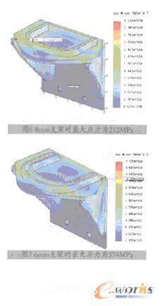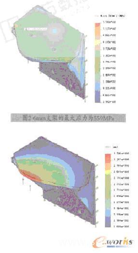 在空气弹簧最大工作载荷作用下,支架的最大应力为559MPa (见图2) ,最大位移为3.6mm(见图3)。而材料Q345B的许用应力要求不得超过280MPa,焊缝区域小于230mm。因此,基本结构的应力计算值已是材料许用应力的2倍,必须对结构进行强度优化。根据设计经验,我们首先将板材厚度由6mm增加到8mm(板材10mm厚已没有布置空间,不再考虑),重新计算,两者之间基本结构强度的分析对比见表1。当板材厚度增加到8mm厚时,其计算结果分别如图4、图5所示