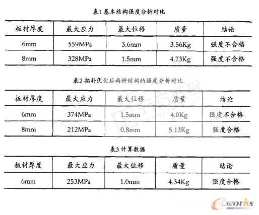 在拓朴优化多种方案的对比中,我们发现8m m板材的结构尽管强度合格,且应力分布较为均匀,其最大计算应力为212MPa,说明材料强度较为宽裕;而6mm板材的结构虽然强度不合格,其最大计算应力为374MPa,但是该点属于应力集中点。根据弹性力学论,在尖角处应力无穷大,所以此处应力计算值发散、不真实。并且,应力云图中很少有高应力区域,说明该结构可以进一步优化。我们最后确定结构方案是板厚为6mm,其计算结果分别见图8、图9,主要计算数据如表3所示。