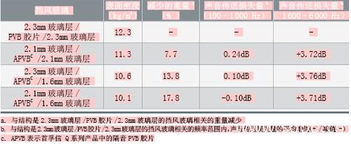 试验表明,较薄的隔音挡风玻璃的隔声表现要优于较厚的标准挡风玻璃。标准夹层玻璃的表面密度为12.3kg/m2,隔音夹层玻璃的为11.3kg /m2。尽管隔音夹层玻璃重量轻、厚度薄,但它在质量控制的频率范围内的隔声效果可与较重的标准夹层相媲美,且在高频率范围内能减少符合频率下垂现象和隔断更多的噪声。这主要归功于隔音中间膜的高阻尼特性。上表列出了几种隔音挡风玻璃的结构和减重的潜力。