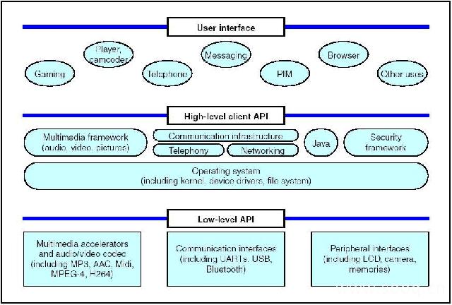 底层硬件设备包括多媒体加速器/音视频编译码器、UART接口、USB接口、Bluetooth等通讯接口,以及LCD控制器、照相机等一般性应用的标准硬件接口;中间部分主要包含处理核心、设备驱动程序和文件系统的操作系统功能,以及多媒体架构、语音及网络的通讯架构、Java和安全性架构等;语音、游戏、短信、浏览、PIM等功能位于上层的应用软件部分。