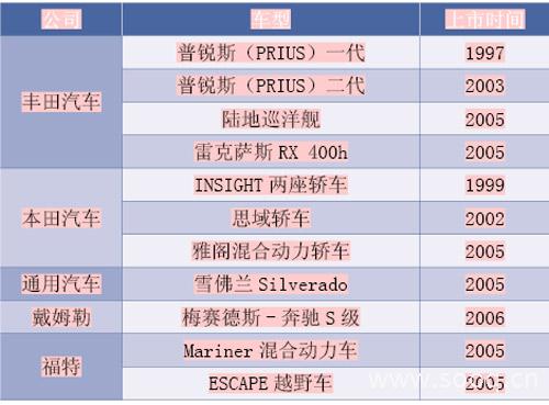1995年丰田公司成功开发了世界上首辆实用型混合动力轿车普锐斯(PRIUS),并于1997年开始量产并销售。之后,本田、通用等各大汽车制造厂商都开始相继推出或准备推出自己的混合动力车型。由于各大汽车厂商都逐渐开始重视混合动力车市场,也逐渐加大了在该领域的投入,所以2000~2005年全球混合动力车产量上升了近6倍多,而在增加的产量里,日本的丰田和本田占有相当大的比例,丰田的普锐斯和本田的INSIGHT被评为最省油的车型。