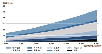 发动机的摩擦功耗对燃油消耗可产生重要影响。而且由于当前发动机的燃烧效率不断提高,发动机摩擦功耗对油耗的影响日益凸显,特别是在部分负荷工况下。NEDC(新欧洲试验规范)的测试循环也证明了摩擦功耗对燃油消耗的极大影响。现代发动机摩擦功耗的主要来源是活塞组件,包括活塞及活塞环。另外,曲轴及轴瓦组件、气门组件及其他一些附件也产生摩擦功耗。
