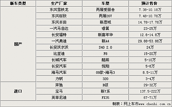 据记者统计09年第一季里各大汽车厂商将推出15款新车,其中国产新车达到12款、进口新车为3款。下面不妨让我们提前来看一看在09年第一季这段时间里将要上市的车型吧。