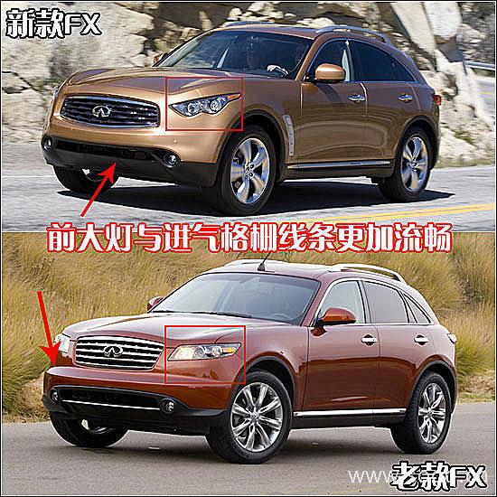 新款FX车型的前脸看起来更运动,更现代。外观上的变化包括前挡泥板,带有英菲尼迪大标识的双拱形格栅,L型的HID双氙头大灯及一体化的雾灯。这两款车的发动机均配备全新的七速自动变速器及手动控制的镁质换档拨片,还有“驾驶员支持”模式能够将挡位时间拉长,并提升了油门反应速度,以提供更具运动性能的驾驶体验。