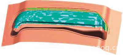 以侧顶盖为例,产品设计数模如图4所示,依据相关控制条件和经验分析确认初步的拉延造型数学模型结果(见图5)。这样的产品结构和造型是否合理呢?实体模型条件下无法进一步验证,只能在最终模具调试阶段才能确认。