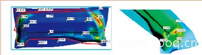 在现有的工艺条件下,就可以依靠计算机辅助进行分析论证,在论证通过的前提下再进行实物制造,既缩短了开发周期又降低了风险。图6为依据产品数模、产品给定材料及料厚情况下进行CAE分析的各阶段效果图。图7左部为Y向板料收缩示意图,右部为料厚减薄结果局部放大视图。从图中可以看出侧顶盖后上部局部材料减薄达到40%以上,即产生了开裂,需要进一步优化产品结构或者改善工艺补充。