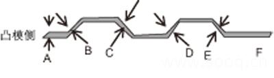 测量方法为:铅丝旁放40mm×40mm的方板,标准压力下进行冲压,测量冲压后的铅丝各部分厚度以获得拉延筋间隙。测量部位及拉延筋形状如图3所示(铅丝1.6mm圆形,材料板厚t=0.7mm)。按模具图示共测量15处铅丝数据,实际测得数据如表4所示。