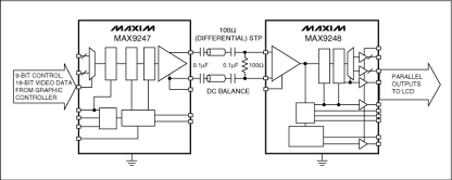 第一代LVDS器件的缺陷是需要四对儿双绞线(8路输出)达到所要求的数据传输速率,8条数据线使机械结构变得复杂,难以安装,与一对儿传输线相比成本要高得多。第二代LVDS器件对此进行了改进,例如MAX9247/MAX9248 (图2),采用一对儿双绞线同时传输数据和时钟。