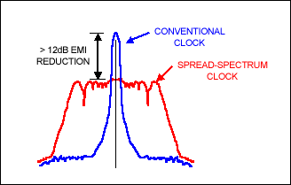 第二代器件的速度能够达到42MHz,数据速率高达1.15Gb。时钟频率的提高导致更强的电磁辐射,可利用扩频传输技术减小EMI。扩频技术在时钟频率中加入抖动,将原来的EMI峰值能量扩散在较宽频带。由于能量不变,EMI的最大峰值被减小(图3)。