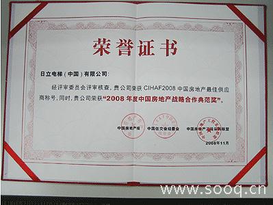 2008年12月1日,日立电梯(中国)有限公司获“CIHAF2008中国房地产最佳供应商”称号,同时还获得“2008年度中国房地产战略合作典范奖”。在本届房地产最佳供应商的评选中,日立电梯是电梯行业唯一获得“战略合作典范奖”的企业。