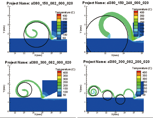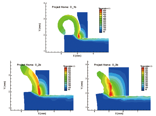 AdvantEdge FEM采用有限元法进行切削过程的物理仿真,作为切削条件输入的内容包括:工件材料特性、刀具几何、刀具材料特性、切削速度、冷却液参数、刀具振动参数、切削参数等。软件通过有限元分析后,获得切削加工过程中的切削力、切屑打卷、切屑形成、切屑断裂、热流、刀具工件和切屑上的温度分布、应力分布、应变分布、残余应力分布等物理特性输出结果。图1所示为3种刀具的切削仿真及切削力比较;图2所示为不同切削参数的切屑形成及温度分布情况。